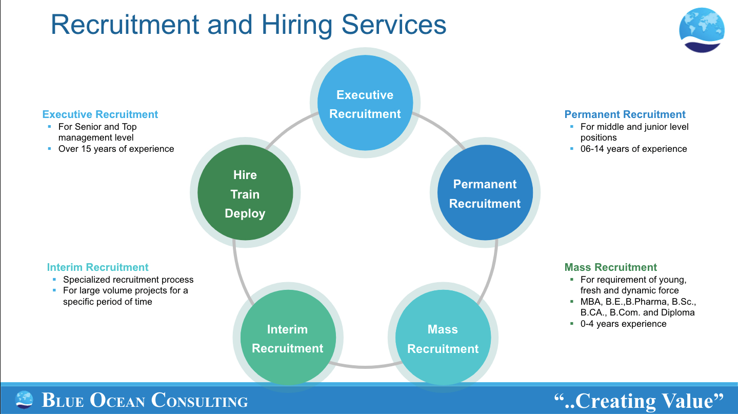 Executive Recruitment For Senior and Top management level Over 15 years of experience Permanent Recruitment For middle and junior level positions 06-14 years of experience Interim Recruitment Specialized recruitment process For large volume projects for a specific period of time Mass Recruitment For requirement of young, fresh and dynamic force MBA, B.E.,B.Pharma, B.Sc., B.CA., B.Com. and Diploma 0-4 years experience