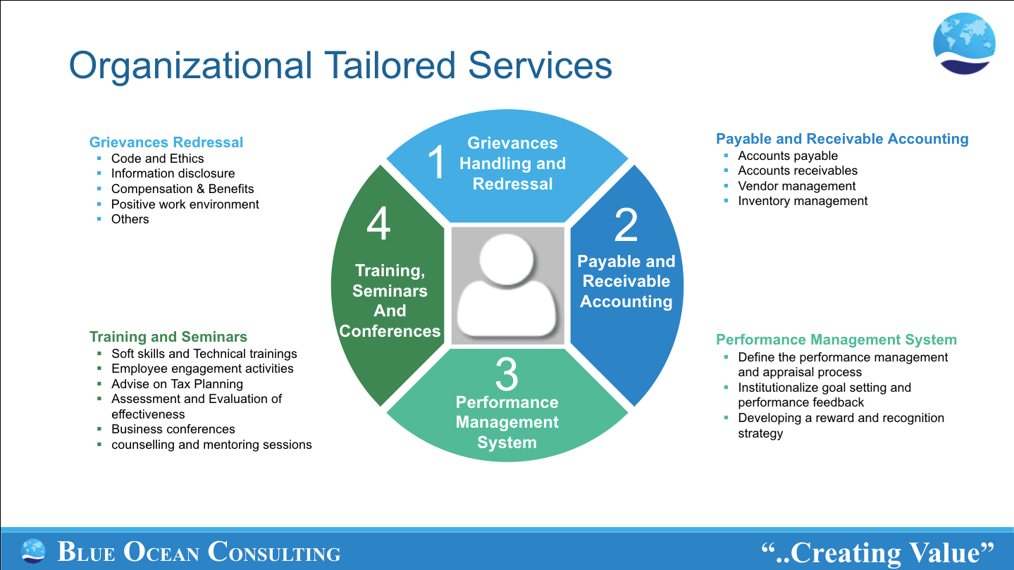 Training and Seminars Soft skills and Technical trainings Employee engagement activities Advise on Tax Planning Assessment and Evaluation of effectiveness Business conferences counselling and mentoring sessions